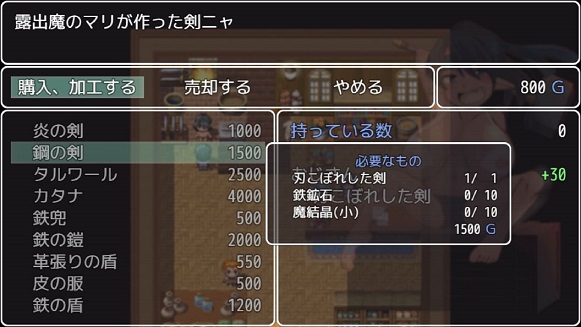 道具屋兼武器屋で装備は購入できますが、武器だけは素材を集めて強化をしていく形になります。