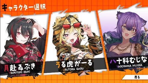左から月赴ゐぶき ・うる虎がーる ・八十科むじなの3人からキャラクターを選んでプレイが出来ます。