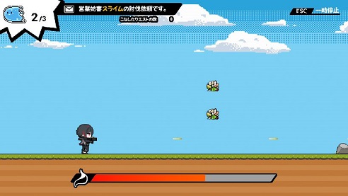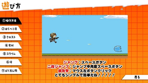 ゲーム画面ではドットキャラを動かしショット・ジャンプ・2段ジャンプをするだけ、