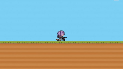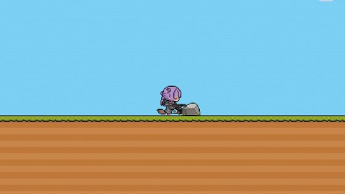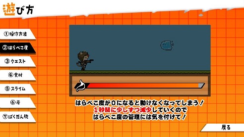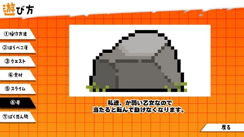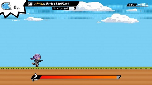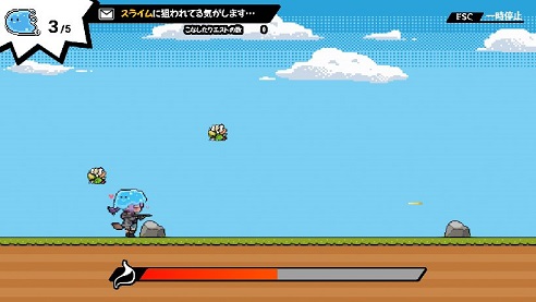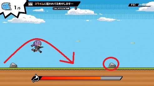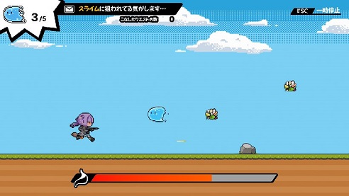 キャラクターは自動的に走ってくるので地面の石を避けたりスライムを倒し続けるアクションゲームです。