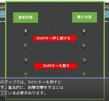 まずは銃を撃つための「姿勢」、これは「Shiftキー」を押すと現在向いている方向に銃を向けます。