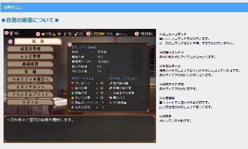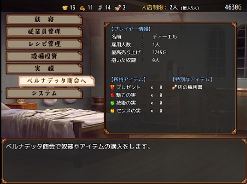 自室メニューでは「設備投資」・「レシピ管理」・「ベルナデッタ商会」のコマンドが解禁。
