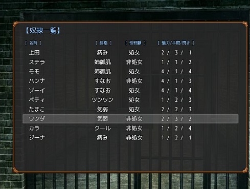初回は条件付きで奴隷を好みを選択、キャラクター一覧が表示されます。