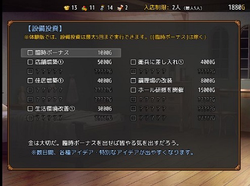 自室メニューは初回でやることが無いので就寝、翌日から開店をします。