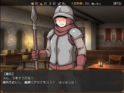 衛兵に差し入れをすると食堂の治安が改善、迷惑客が減少していきます。