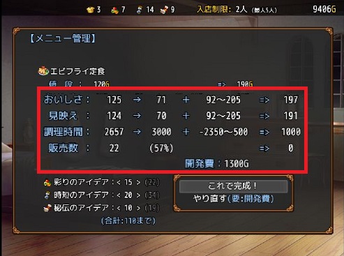 やってみて驚いたのは調理速度2600台だったエビフライ定食がレシピ改善で最短値の1000へ到達(驚)、